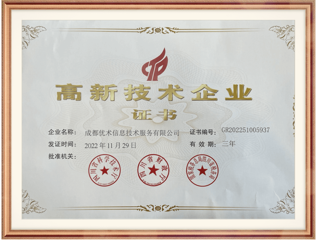 2022年,子公司成都優(yōu)術(shù)信息技術(shù)服務(wù)有限公司獲得“高新技術(shù)企業(yè)”稱號。與千百匠——成都碩昌科技有限公司深度合作,成為其戰(zhàn)略合作伙伴。